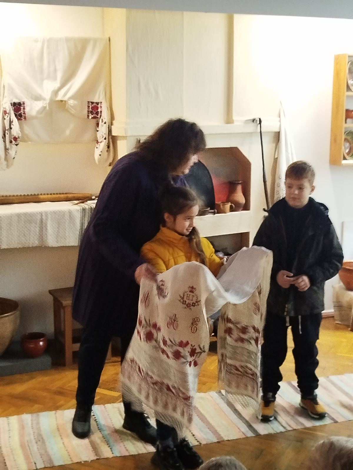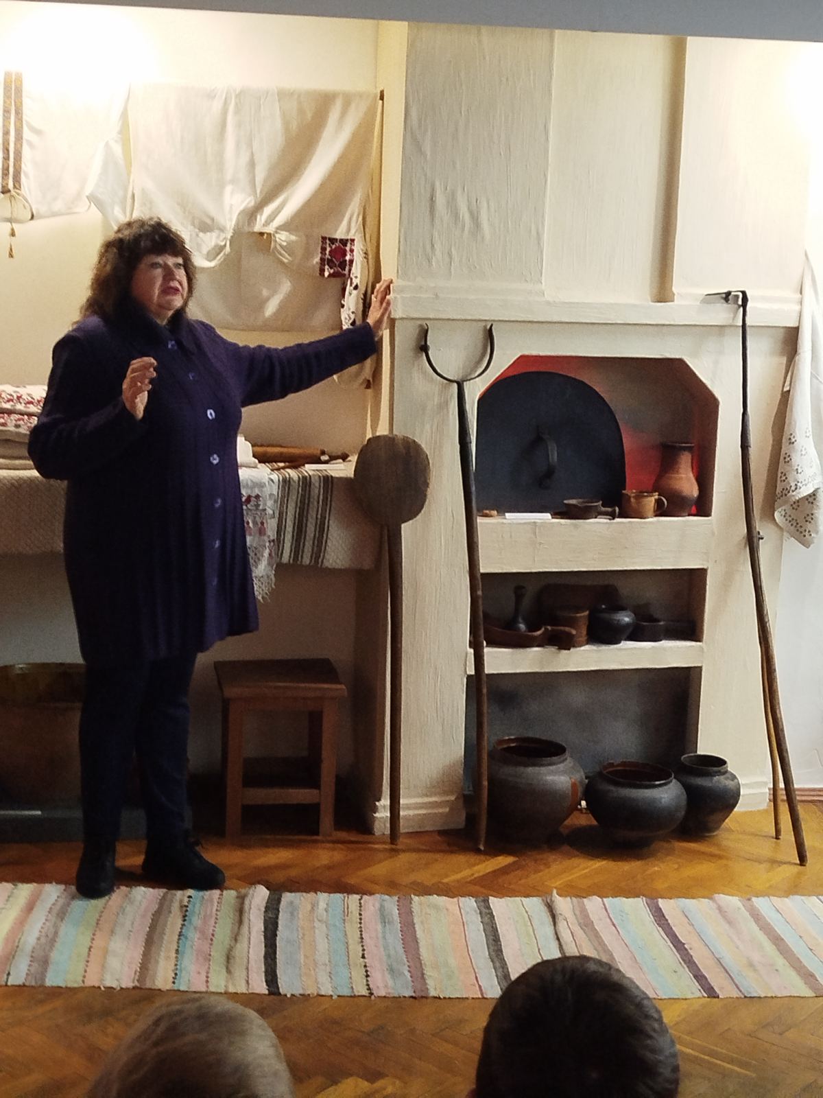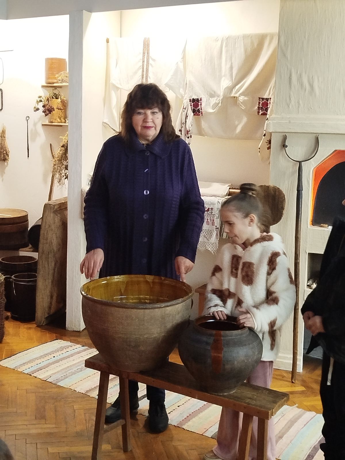 Під час зустрічі науковий співробітник музею Олена Опанасюк ознайомила дітей із важливим елементом традиційної української оселі – піччю, що здавна була справжнім серцем хати. Вона не лише обігрівала помешкання, а й слугувала місцем для приготування їжі, випікання хліба та відпочинку після праці. Біля печі збиралася родина, ділилася новинами, співала пісень, а її тепло вважалося оберегом і джерелом здоров’я.