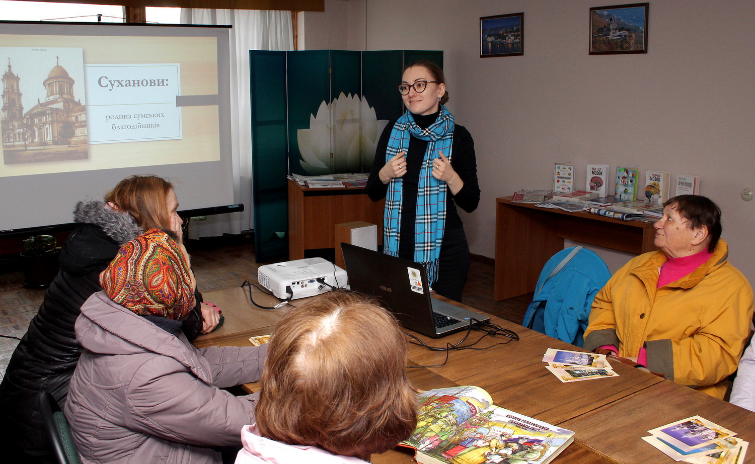 Про життєву позицію та цінності, які залишили представники цієї династії у спадок наступним поколінням, йшлося під час чергової краєзнавчої зустрічі з відвідувачами обласної наукової бібліотеки – переселенцями з прикордоння та членами Клубу «Здорове довголіття». Спікер заходу – канд. іст. наук, учений секретар обласного краєзнавчого музею Віра Іванова – розповіла про роль Суханових у житті Сум і Сумського повіту другої половини ХІХ – початку ХХ ст., приділивши окрему увагу історії спорудження архітектурної домінанти міста – Спасо-Преображенського собору.