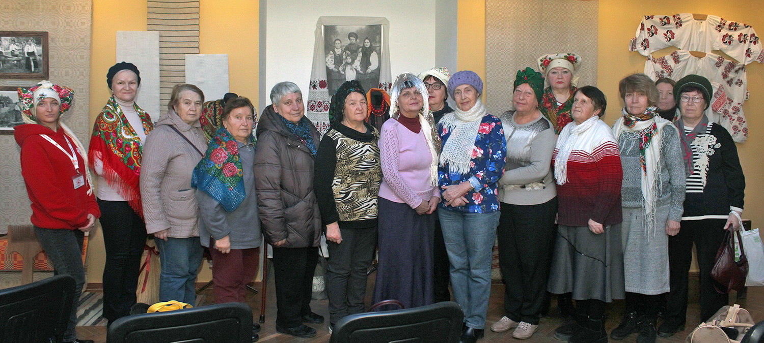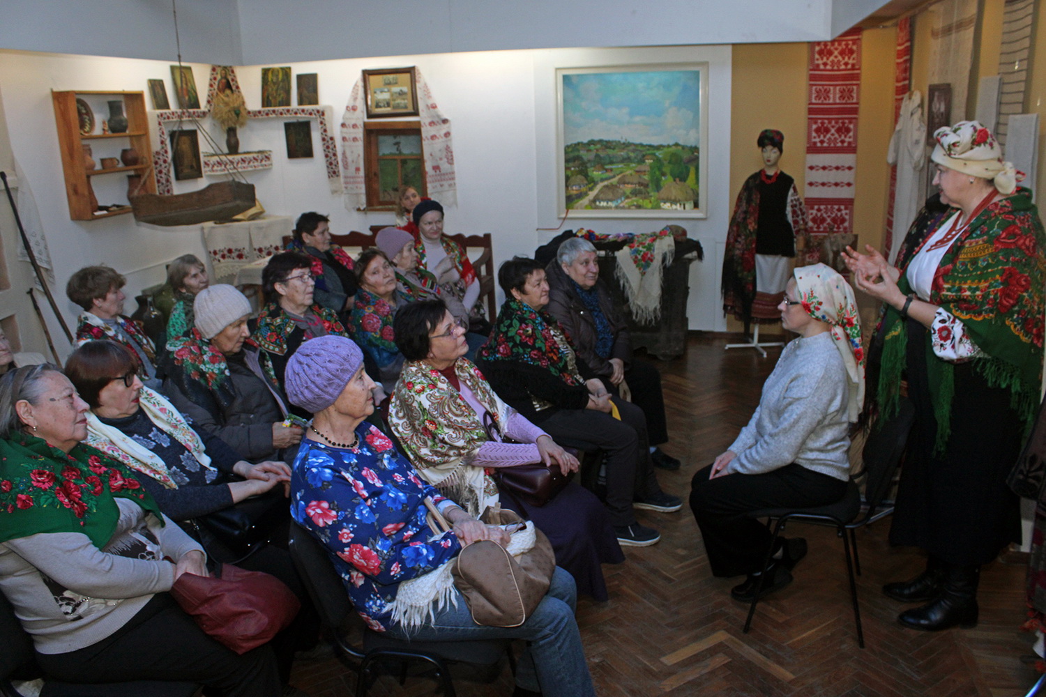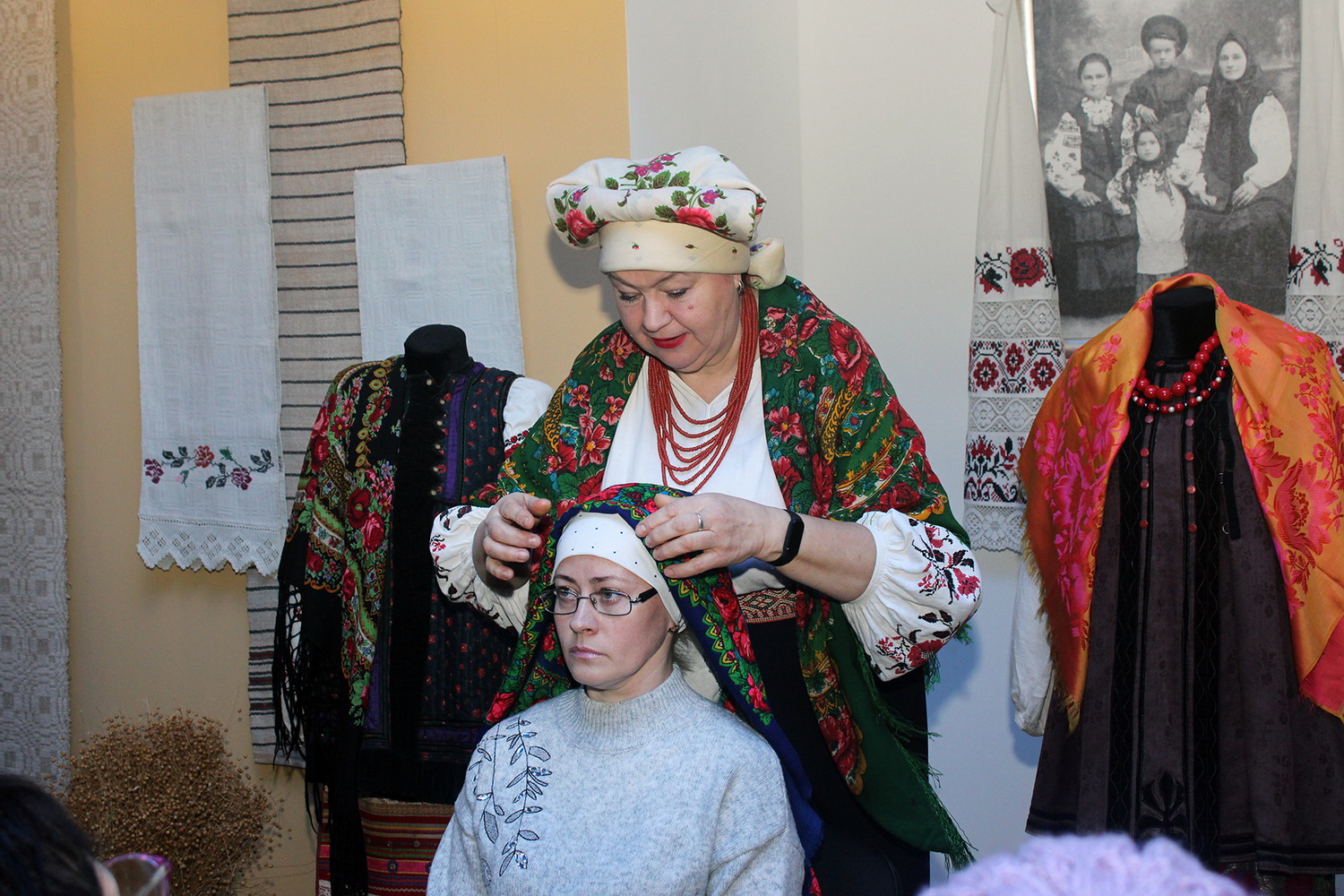 Про українську хустку, традиції та обрядовість розповідали сьогодні в Сумському обласному краєзнавчому музеї. На зустріч завітали учасники Клубу Активного Довголіття «Весна» Сумської обласної організації Товариства Червоного Хреста України. Наукові співробітники продемонстрували давні хустки з фондового зібрання музею та провели майстер-клас з пов’язування хусток.